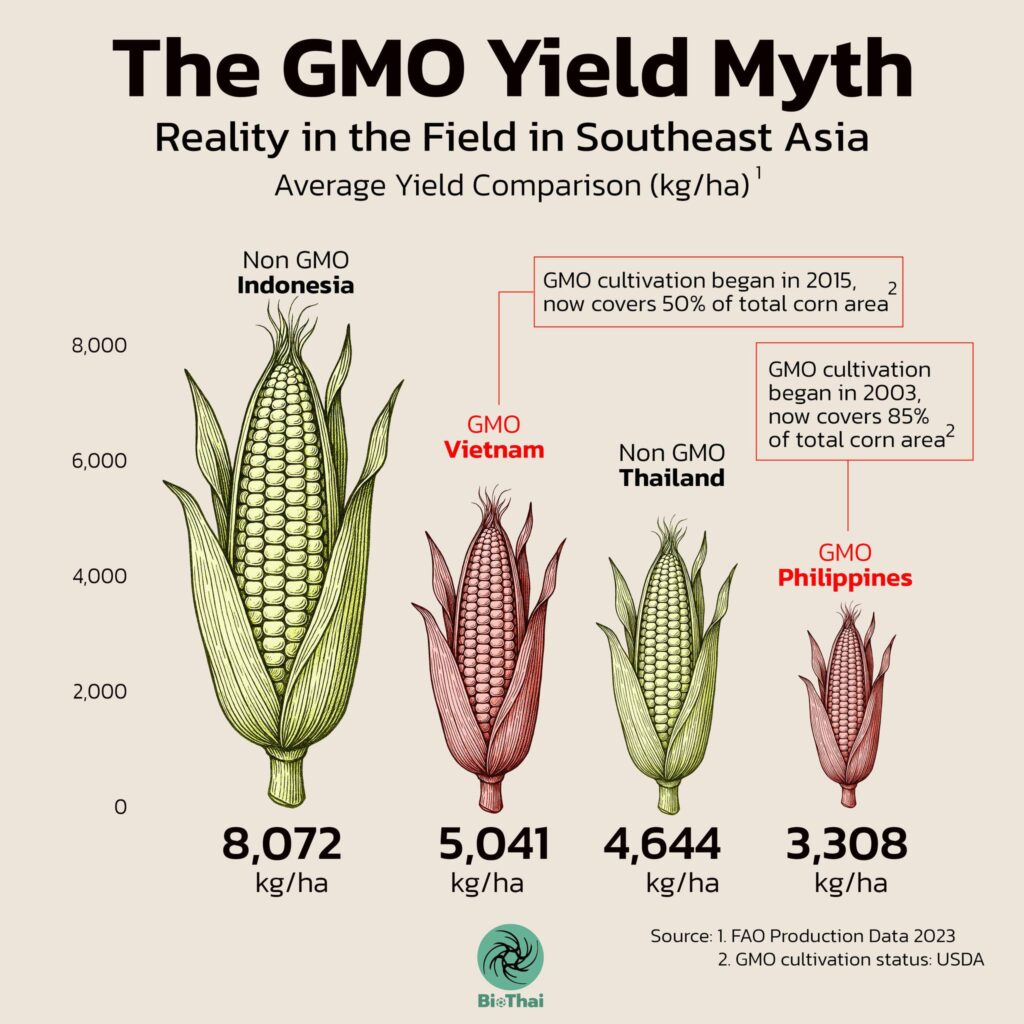 Similarly, Vietnam, where the government approved GMO cultivation in 2013 and now plants GMO corn on 50% of its total corn area, has an average yield of 5,041 kg/ha. This is comparable to Thailand’s yield (4,644 kg/ha), not counting Thai farmers in certain areas who achieve significantly higher yields. Notably, Indonesia, which grows only non-GMO corn, outperforms all with an average yield of 8,072 kg/ha!